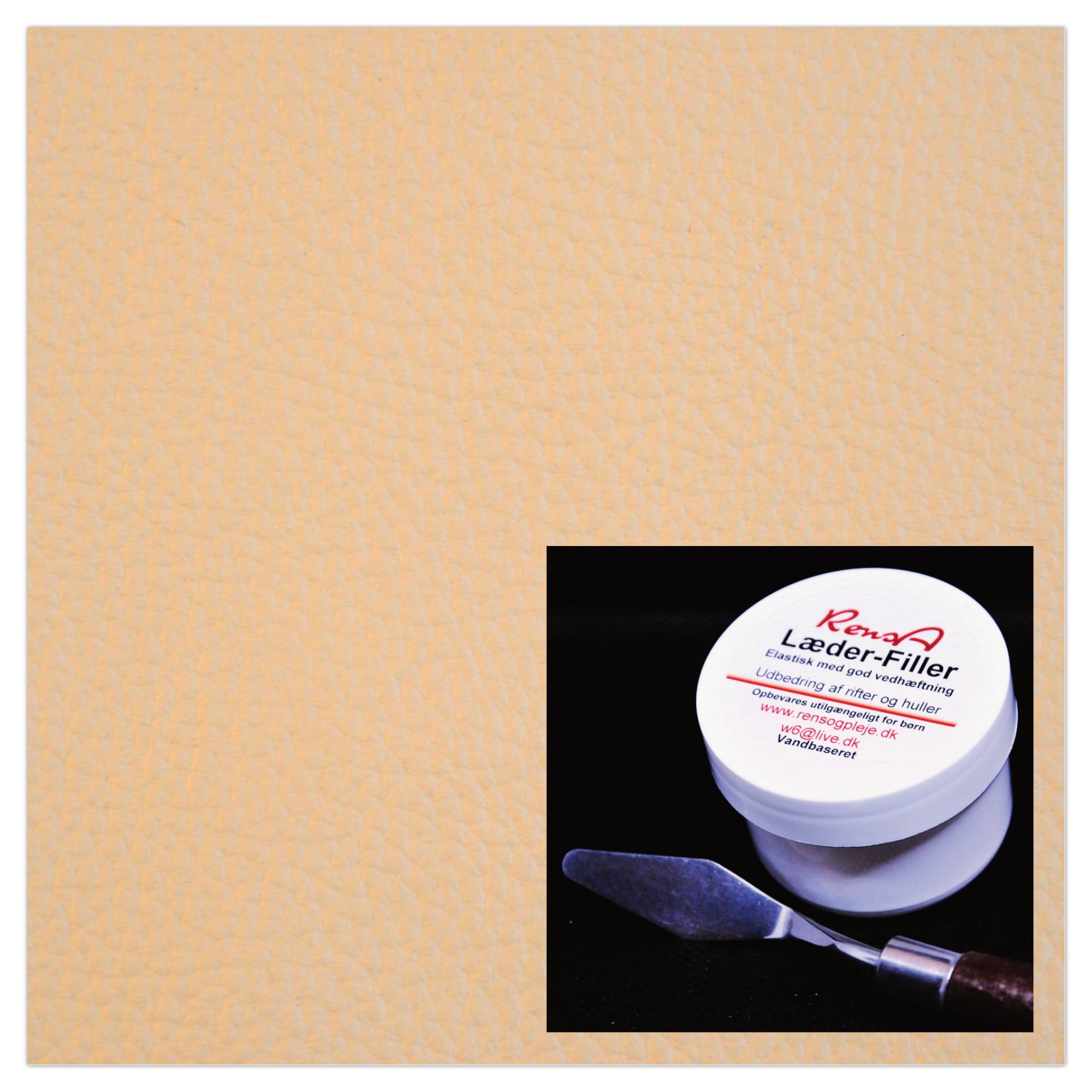 Læder-Filler (flydende læder) er til udbedring og limning af sprækker, narvskader (krakkeleringer), rifter, brandmærker og mindre huller i læder. Læder-Filler er en vandbasseret Læder spartelmasse og lim, med god vedhæftning. Den er meget elastisk og nem at arbejde med. Der medfølger en praktisk spartel til påføringen. Læder-Filler fås i 34 standard farver, og kan også specieltones efter ønske. en bøtte indeholder 40Ml. Læder-Filler. Læder-Filler kan farves over med RensA Læderfarve.