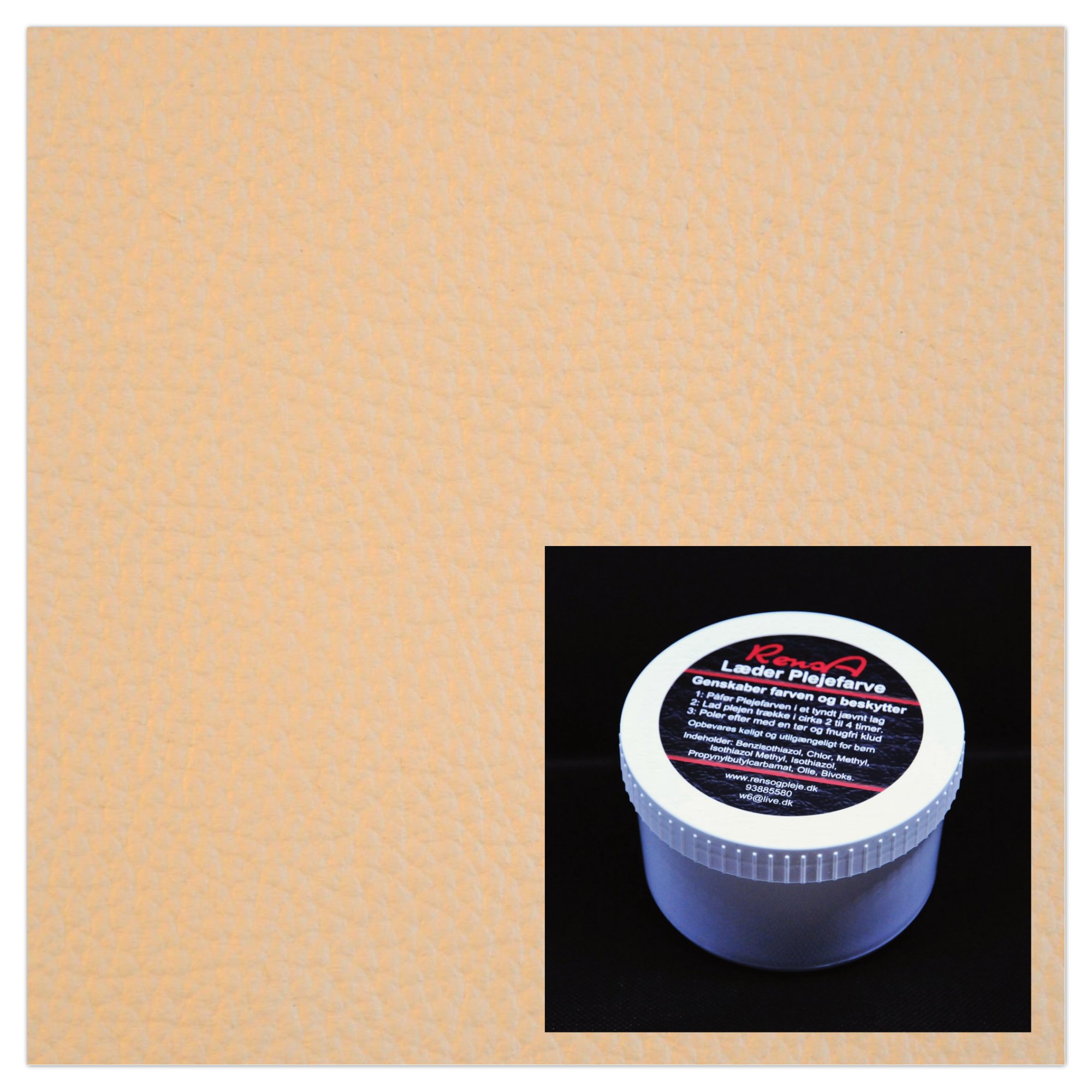Her ud over er det også muligt at få specieltonet Læder-Plejefarven, på de lædertyper hvor farven falder uden for standartfarverne, så Læder-plejefarven passer nøjagtigt til farven på det læder der skal ha opfrisket farven.